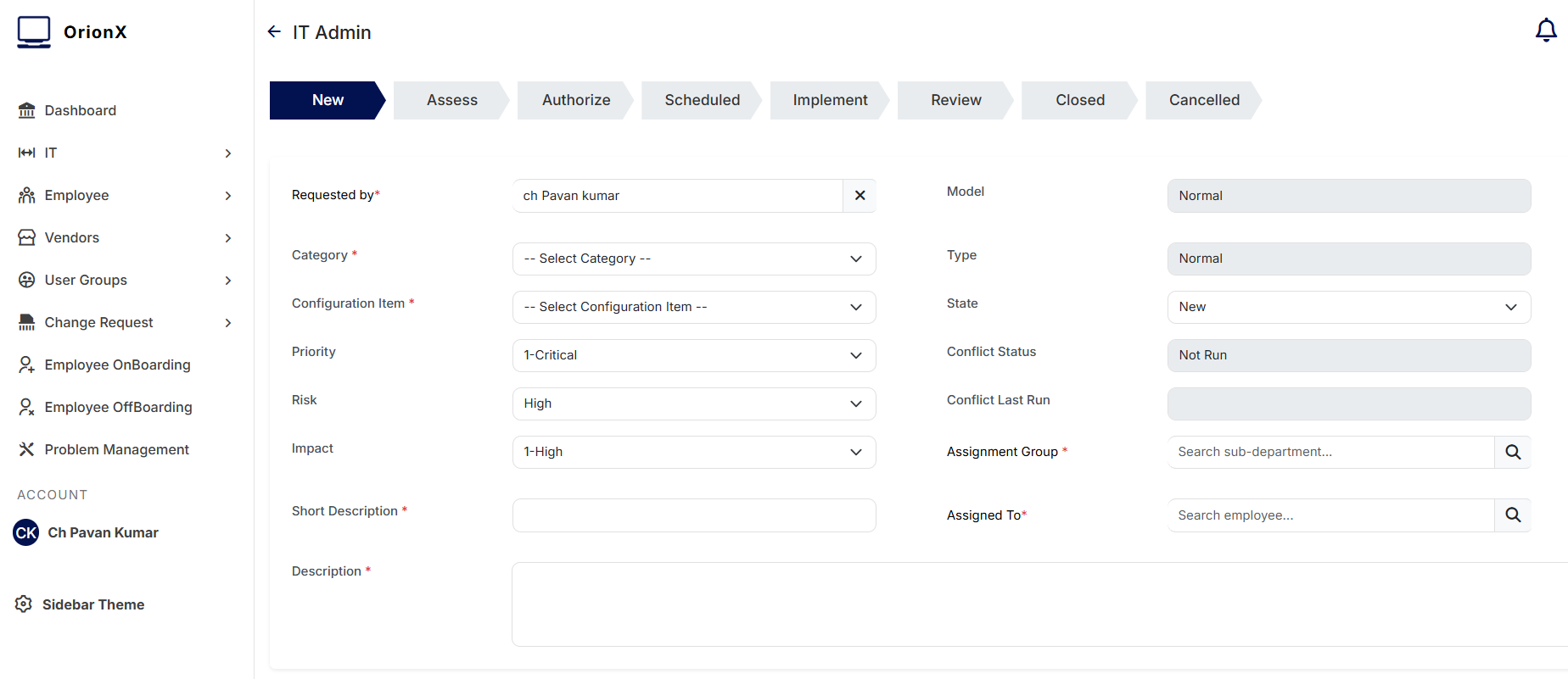 In the New Change Request form, a requester has to fill the details such as: